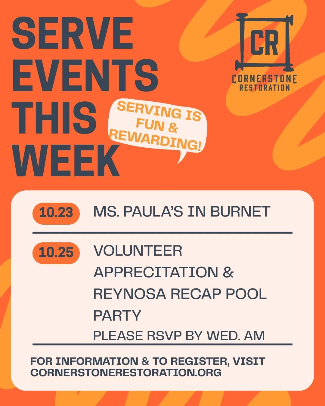 Questions? Call Lisa @ 512-919-9293 or by email lisa@cornerstonerestoration.org